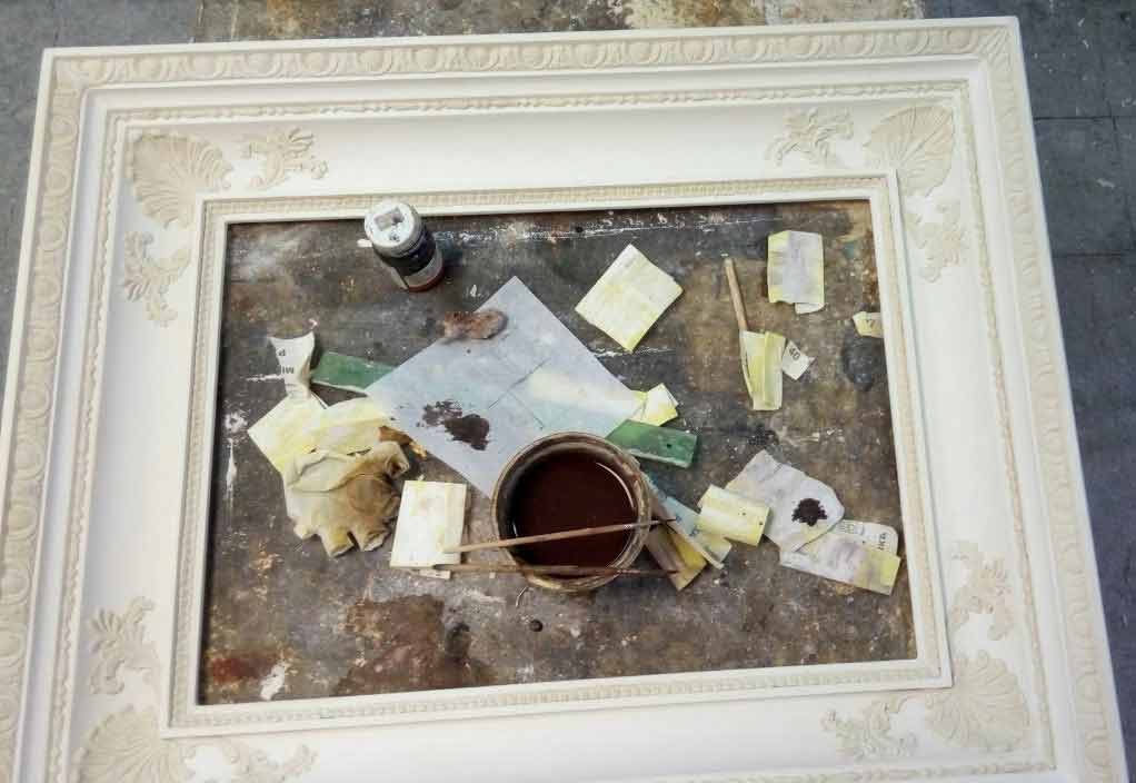 На раме выставляется и укрепляется мастичная или гипсовая лепнина, позволяющая создать глубокий рельеф. Она оттискивается вручную и после высыхания кропотливо подготавливается к позолоте.